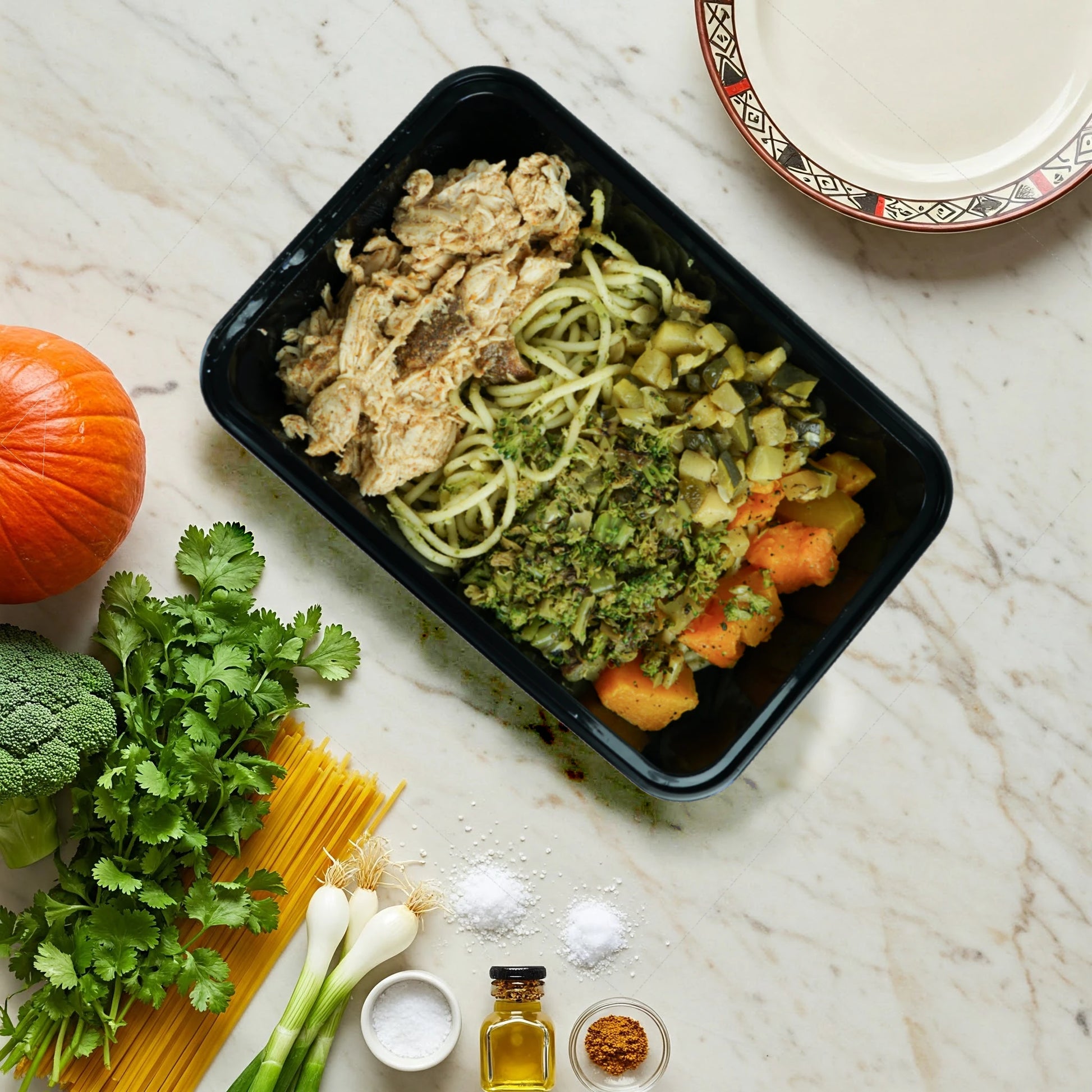 Ingredients: Chicken Breast, Pumpkin, Courgette, Brocolli, Spaghetti, Olive Oil, Toasted Pumpkin Seeds, Spring Onion, Lemon Juice, Fresh Coriander, Salt, Sesame Oil, Fresh Ginger, Garlic, Smoked Paprika, Mustard Seeds, Ground Nutmeg, Ground Ginger, Ground Cumin, Ground Cinnamon, Ground Cardamon, Garlic Powder, Dried Basil, Cayenne Pepper, Black pepper.