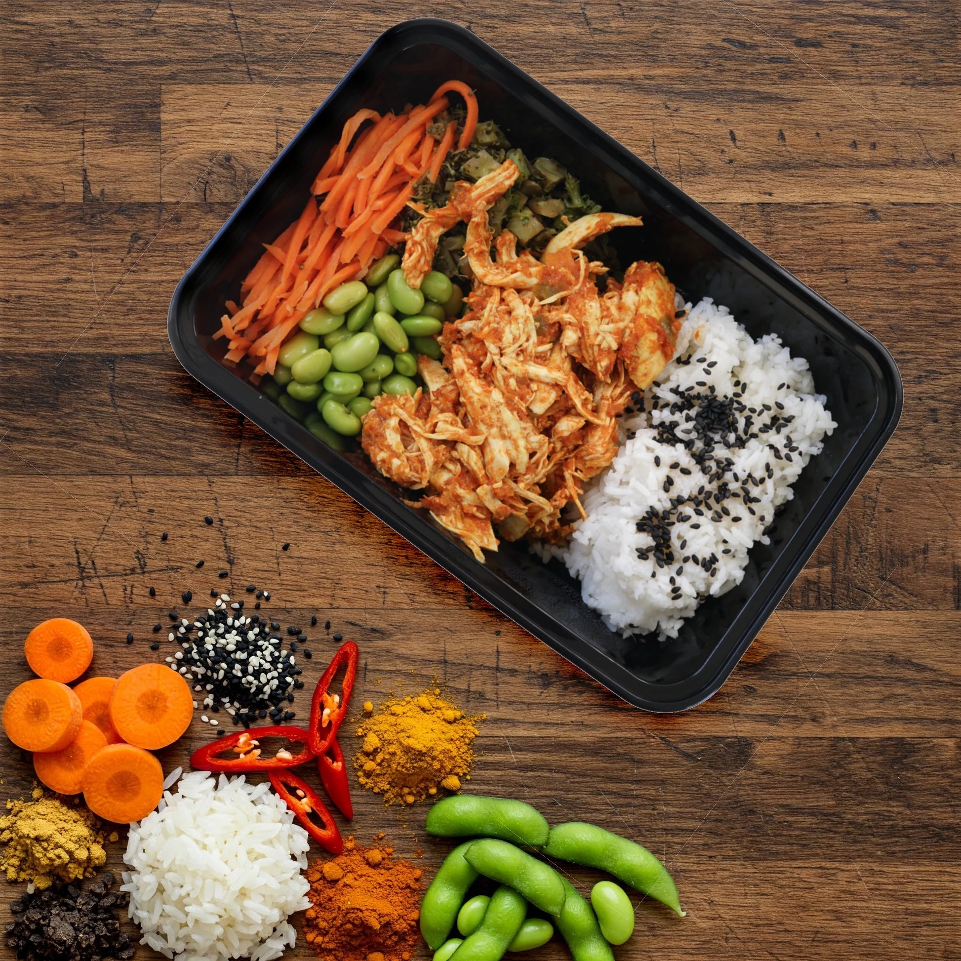 Ingredients: Chicken Breast, Edamame, Jasmine Rice, Brocolli, Carrot, Tomatoes, Onion, Green Capsicum, Olive Oil, Tomato Paste, Fresh Ginger, Salt, Garlic, Chilli Flakes, Smoked Paprika, Ground Cumin, Ground Tumeric, Brown Sugar.